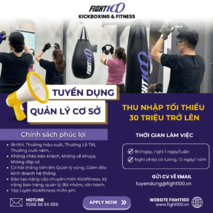 Thông tin về Fight100 Club: Bao gồm chương trình tập luyện 1:1 với HLV và chương trình tập nhóm thiết kế phù hợp với mọi nền tảng thể lực, từ người mới bắt đầu cho đến những người đã có kinh nghiệm trong thể thao. Vị trí này tuyển dụng cho chương trình tập nhóm.