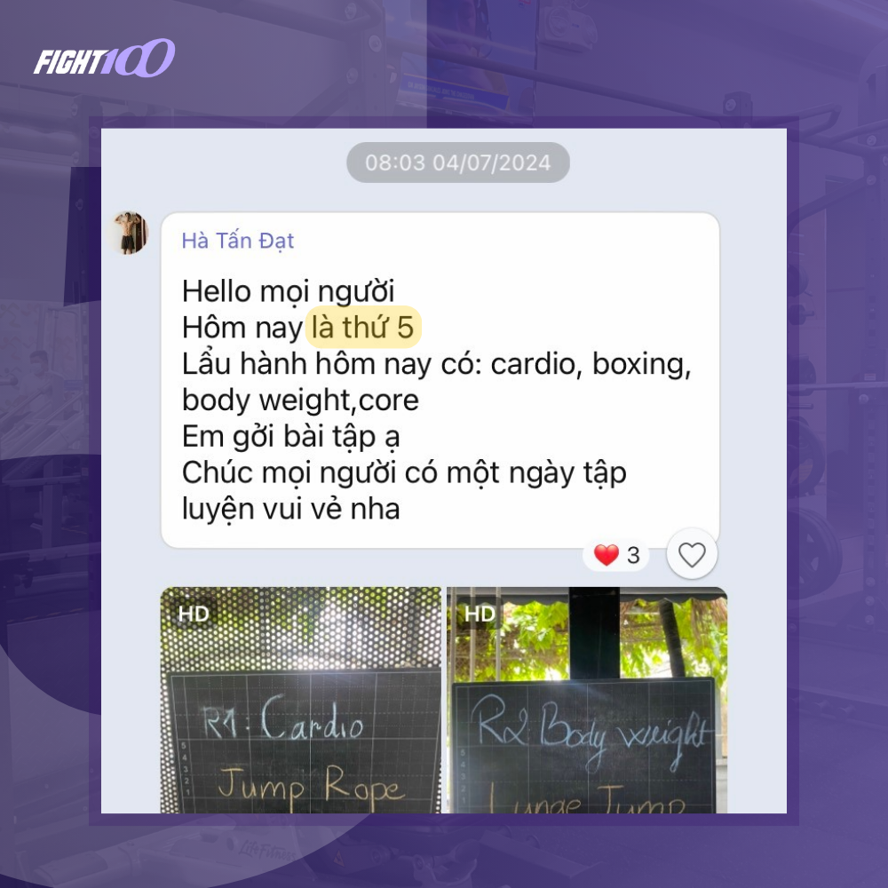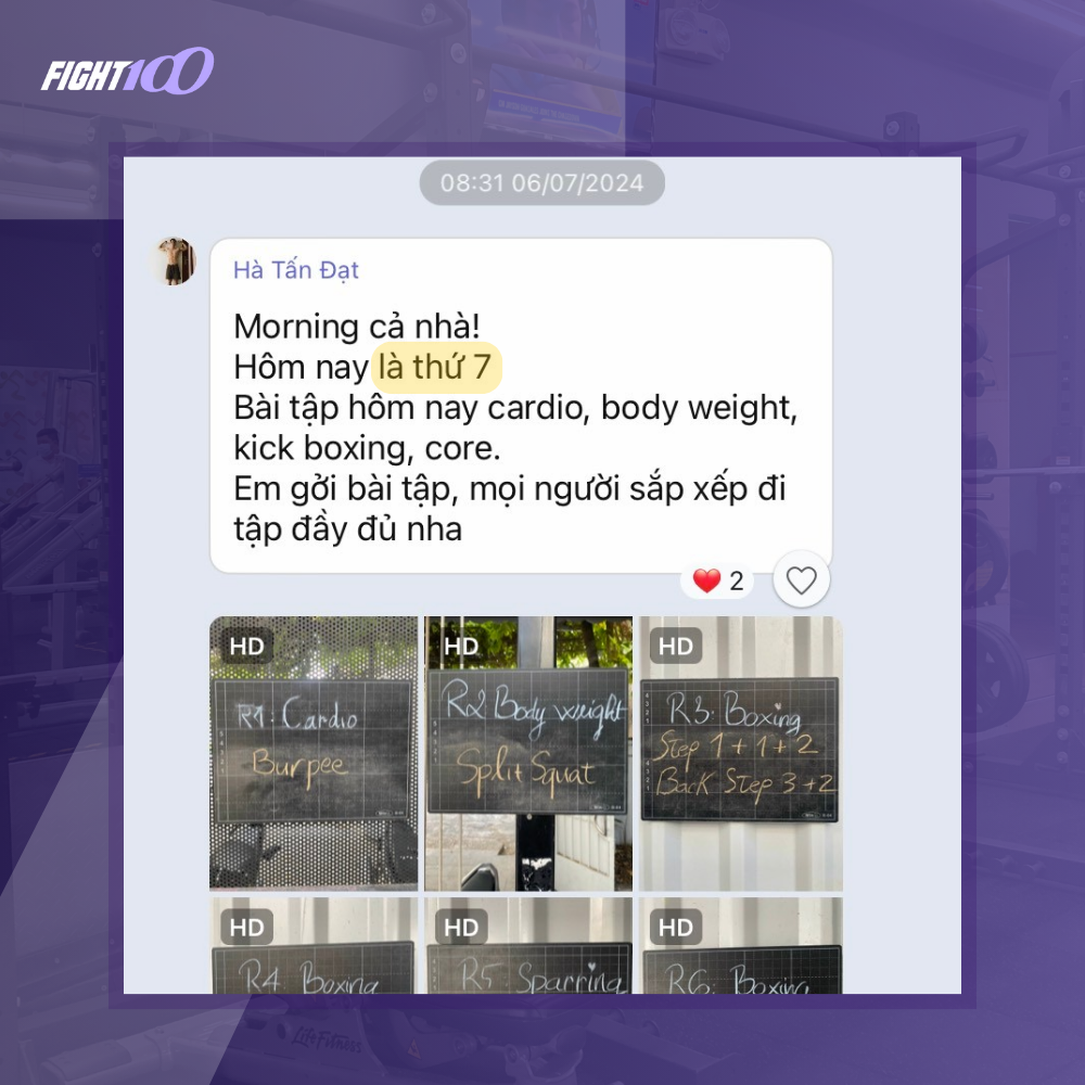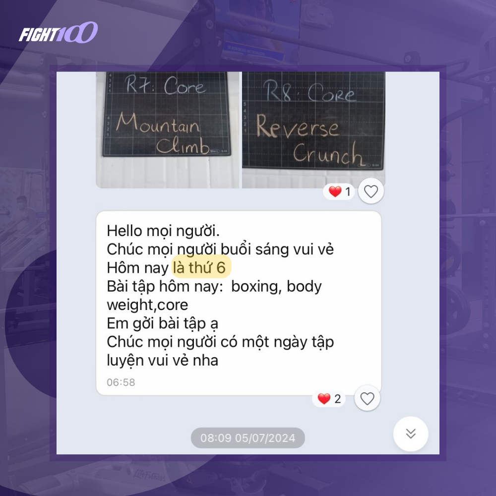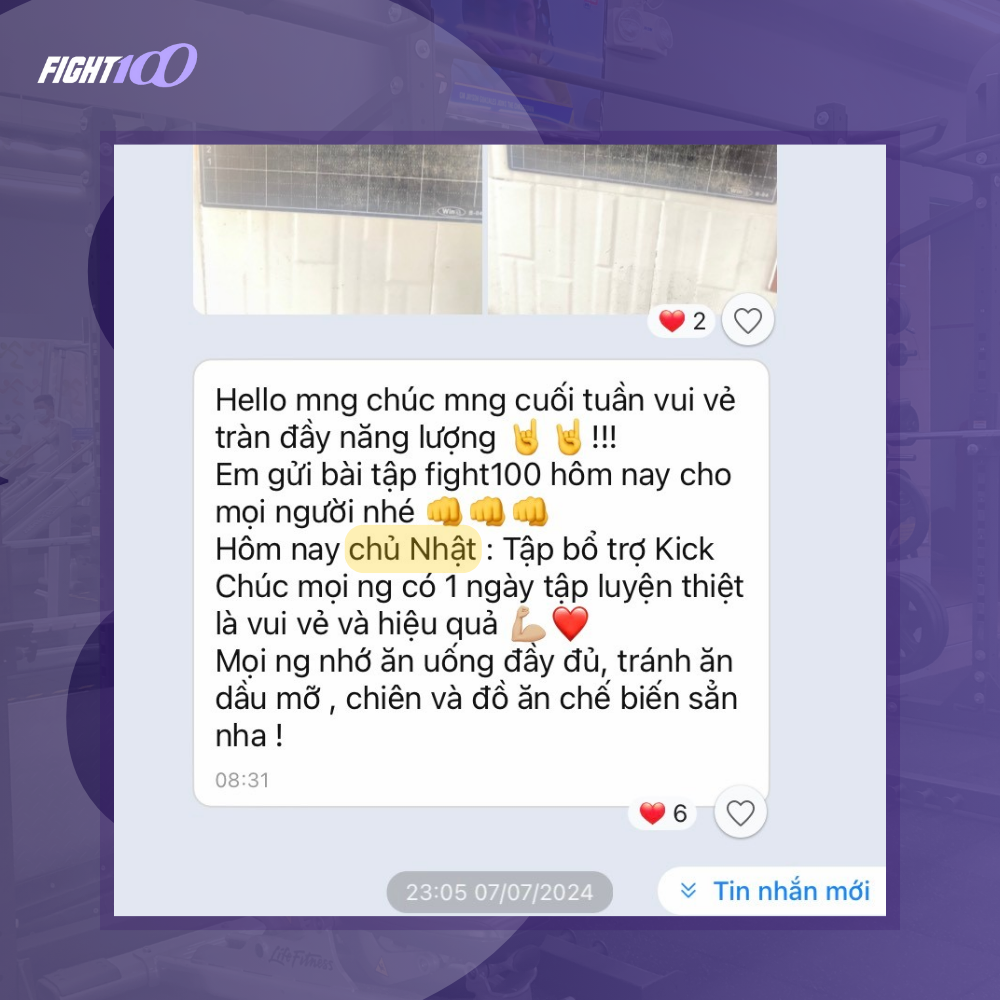 Trên sàn tập của Fight100, bạn sẽ không bao giờ 1 mình. HLV sẽ luôn theo dõi để đảm bảo thực hiện đúng động tác, tránh chấn thương và đạt hiệu suất tốt nhất. Ngoài nhắc nhở tập luyện trong lúc tập thì mỗi buổi sáng, HLV sẽ gửi các bài tập lên group để nhắc nhở mọi người đi tập. Môi trường tập luyện tại Fight100 còn cho bạn những đồng đội cùng cổ vũ, khích lệ nhau hoàn thành bài tập. Với phương pháp tập thú vị, Fight100 mang đến trải nghiệm khác biệt khi tập luyện.